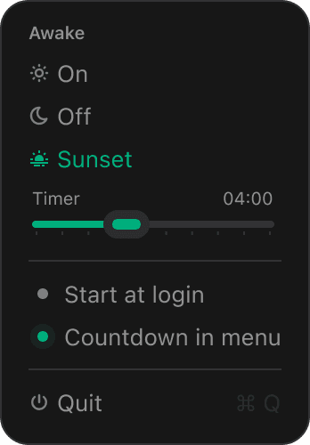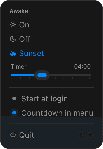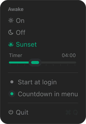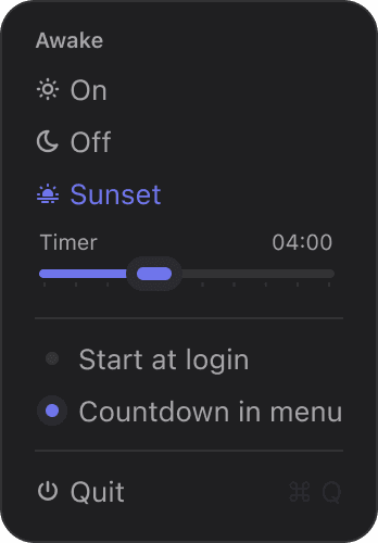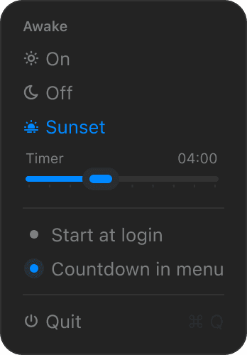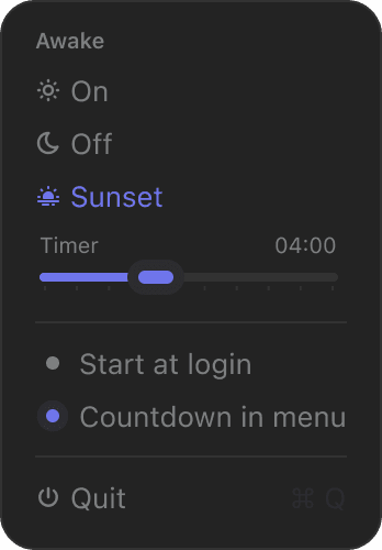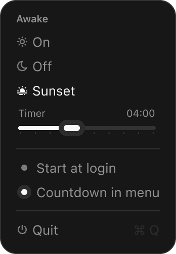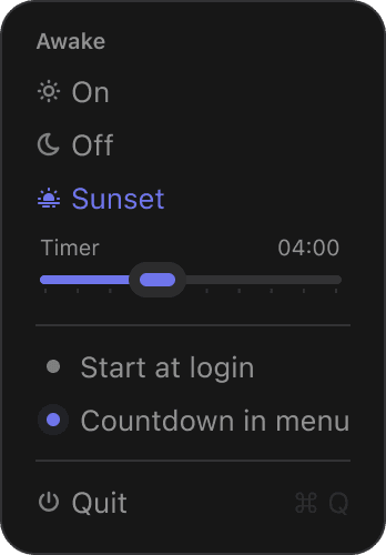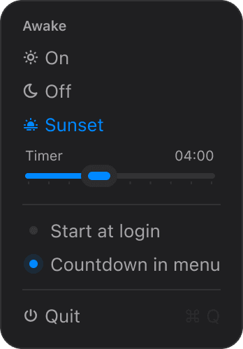 Keep your Mac awake when you need it. Awake offers ☀ permanent mode or timed 🌅 sunset sessions. Beautiful themes, highlight colors, auto-start & menu bar timer. Small. Native. Calm.
